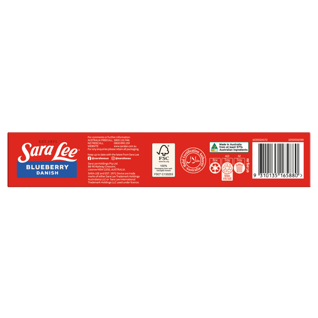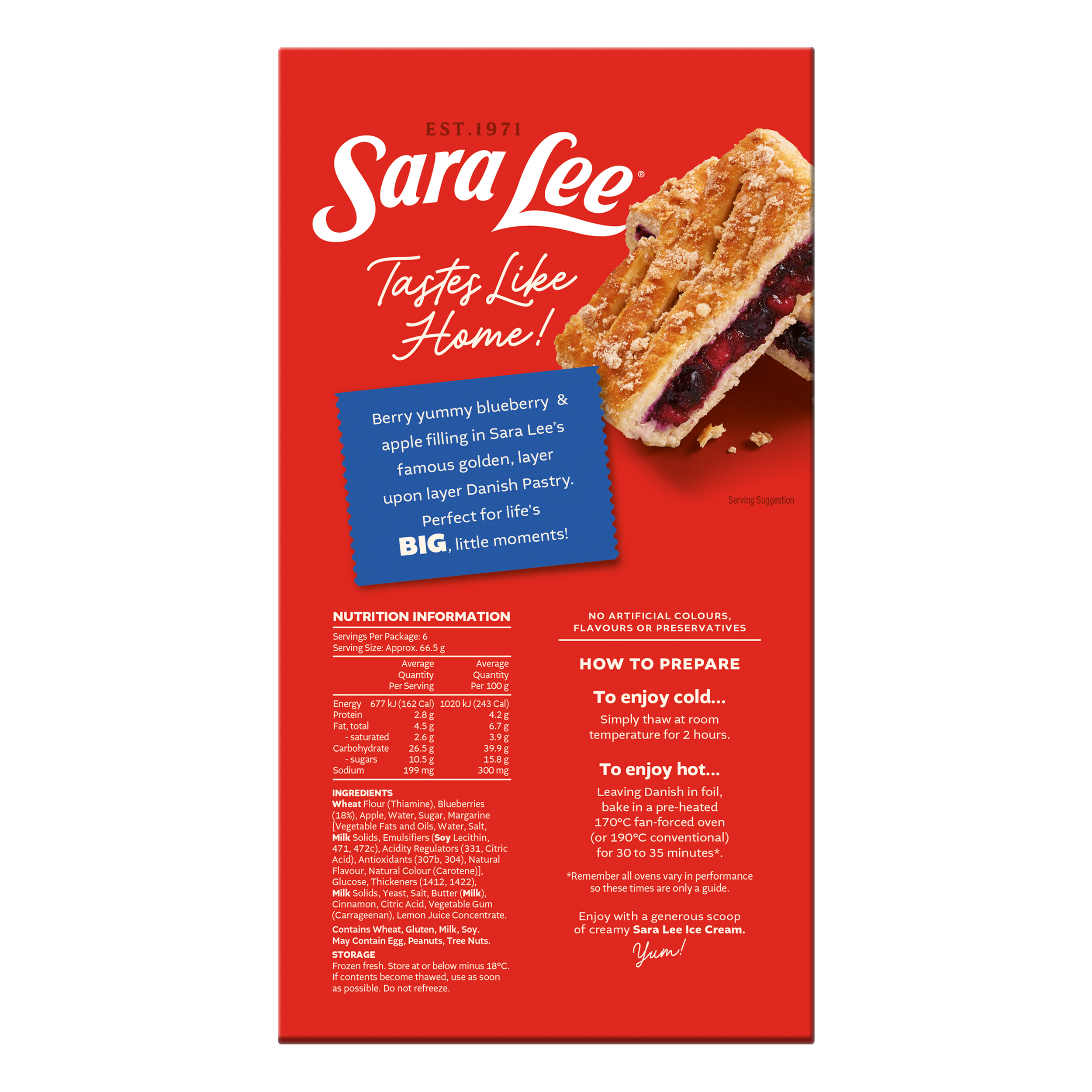 Wheat Flour (Thiamine), Blueberries (18%), Apple, Water, Sugar, Margarine [Vegetable Fats and Oils, Water, Salt, Milk Solids, Emulsifiers (Soy Lecithin, 471, 472c), Acidity Regulators (331, Citric Acid) Antioxidants (307b, 304), Natural Flavour, Natural Colour (Carotene)], Glucose, Thickeners (1412, 1422), Milk Solids, Yeast, Salt, Butter (Milk), Cinnamon, Citric Acid, Vegetable Gum (Carrageenan), Lemon Juice Concentrate.